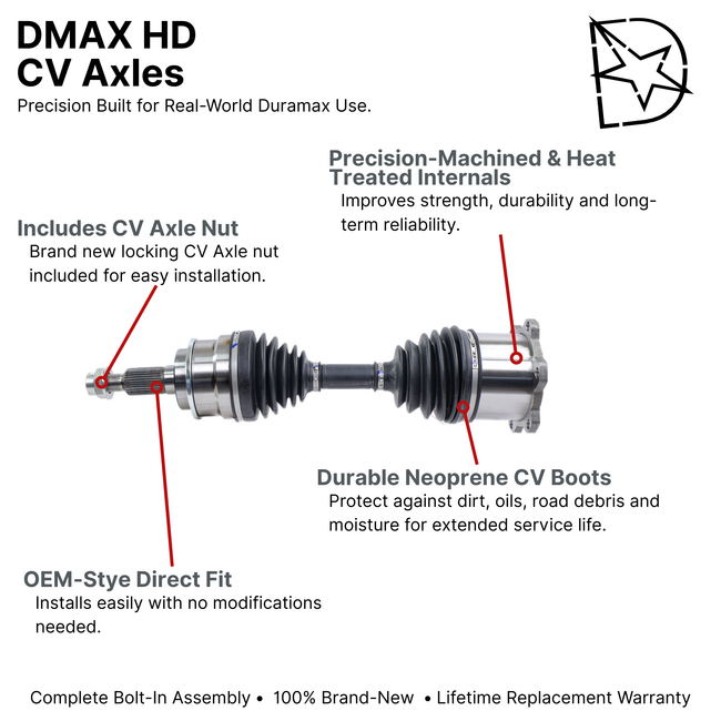Each axle comes fully assembled and includes a new CV axle nut for a straightforward installation. Backed by a Lifetime Replacement Warranty for added confidence.