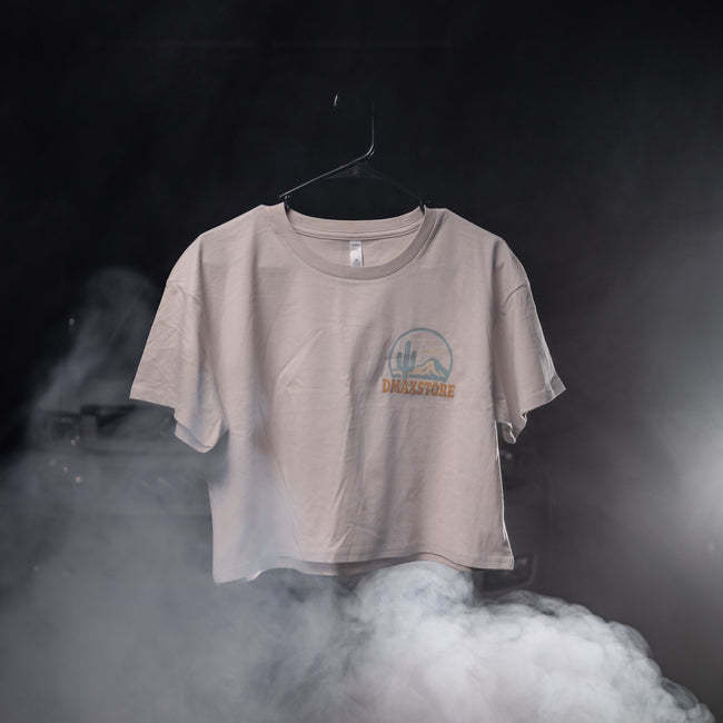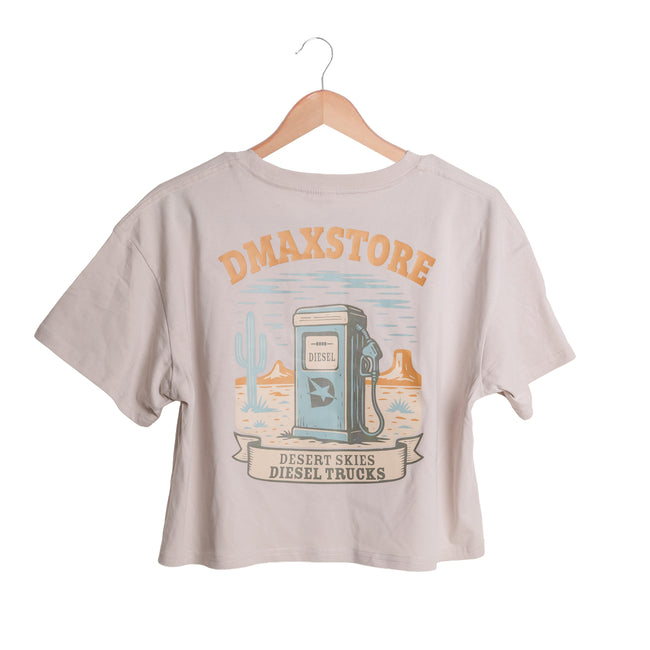 Breathe in the open road and rep your diesel roots with the DmaxStore Women’s Desert Skies Crop Tee. This laid-back, sand-colored crop top brings together comfort, style, and bold diesel pride. On the front, a minimalist desert scene with a saguaro cactus and mountain backdrop is paired with the DMAXSTORE logo in a pop of orange. Flip it over and you’re met with a standout full-back graphic featuring a vintage-style diesel pump surrounded by desert elements and the phrase: “Desert Skies, Diesel Trucks.” With its relaxed fit and soft, breathable cotton, this crop tee is perfect for sunny days, truck meets, or just chillin' in style.